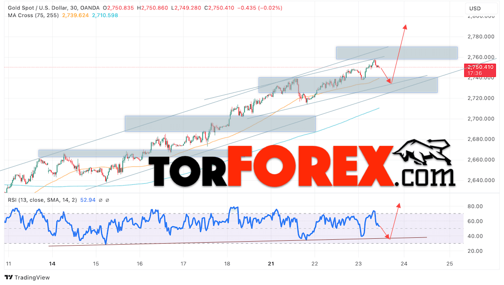 Котировки XAUUSD продолжают движение в рамках развития роста и бычьего канала коррекции. В момент публикации прогноза цена Золота на сегодня составляет 2750 Долларов за Тройскую Унцию. Скользящие средние указывают на наличие краткосрочной медвежьей тенденции. Цены пробили область между сигнальными линиями вверх, что указывает на давление со стороны покупателей актива Золота и потенциальное продолжение роста уже с текущих уровней. На данный момент стоит ожидать попытку развития медвежьей коррекции и тест уровня поддержки вблизи области 2735. Откуда стоит ожидать отскок вниз и продолжение роста цены на Золото с потенциальной целью выше уровня 2805.