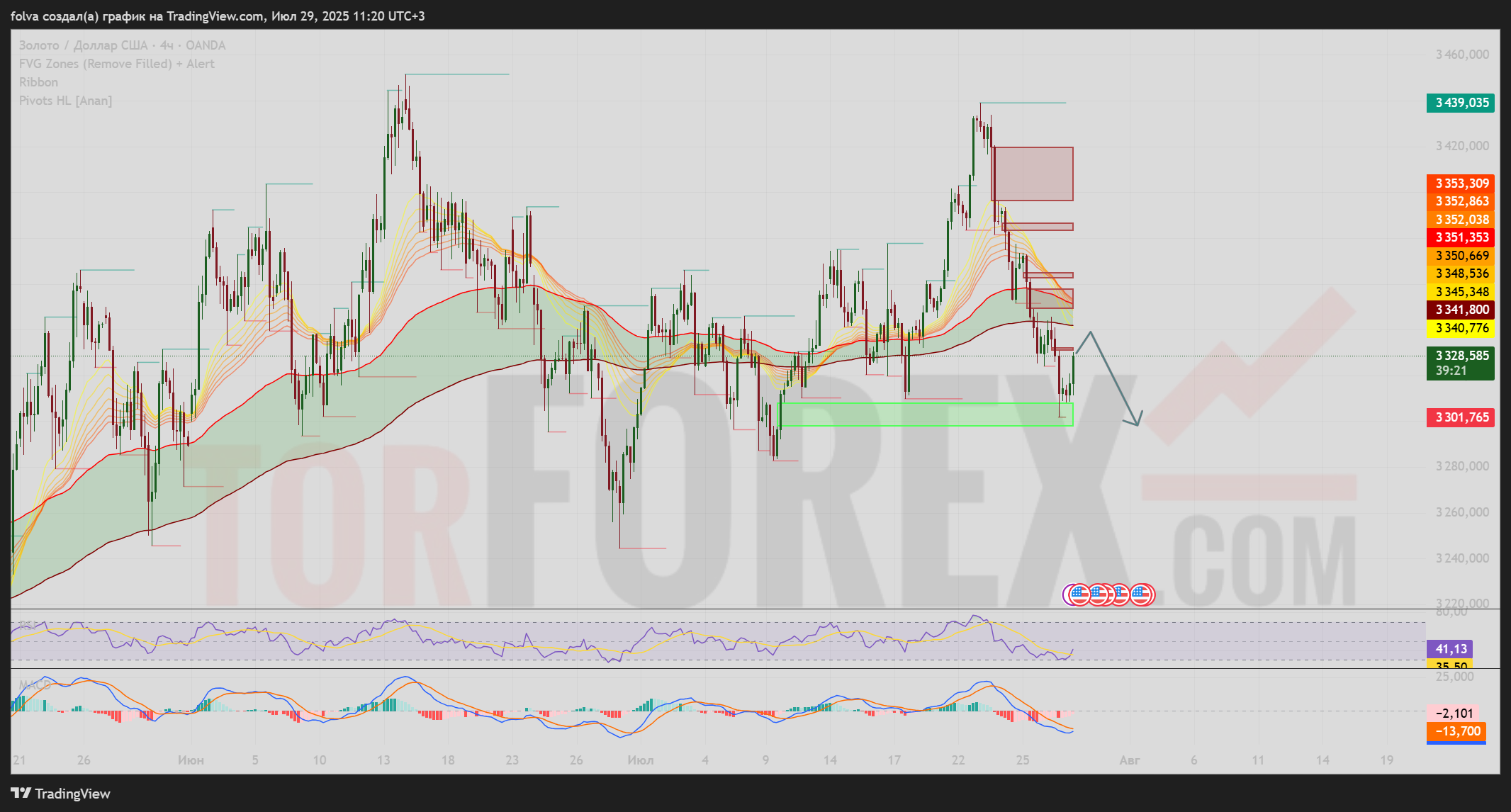 • Поддержка: $3301 (предыдущий минимум), $3270 и $3244 (Order Block и зона накоплений)