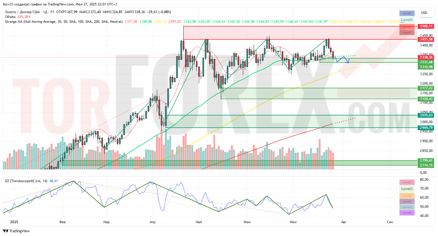 - Зона 3310-3350 USD: Здесь проходит EMA 50, а также предыдущие локальные минимумы, что делает эту область ближайшей сильной поддержкой.