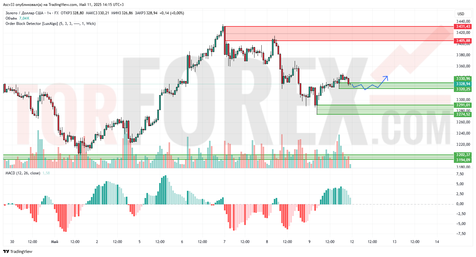 Золото корректируется после отката от зоны сопротивления 3405–3431 и удерживается выше важной зоны спроса 3291–3320. Цена формирует локальную консолидацию с попыткой восстановления. Индикатор MACD показывает устойчивый бычий импульс, а объёмы умеренные, без признаков сильной дистрибуции.