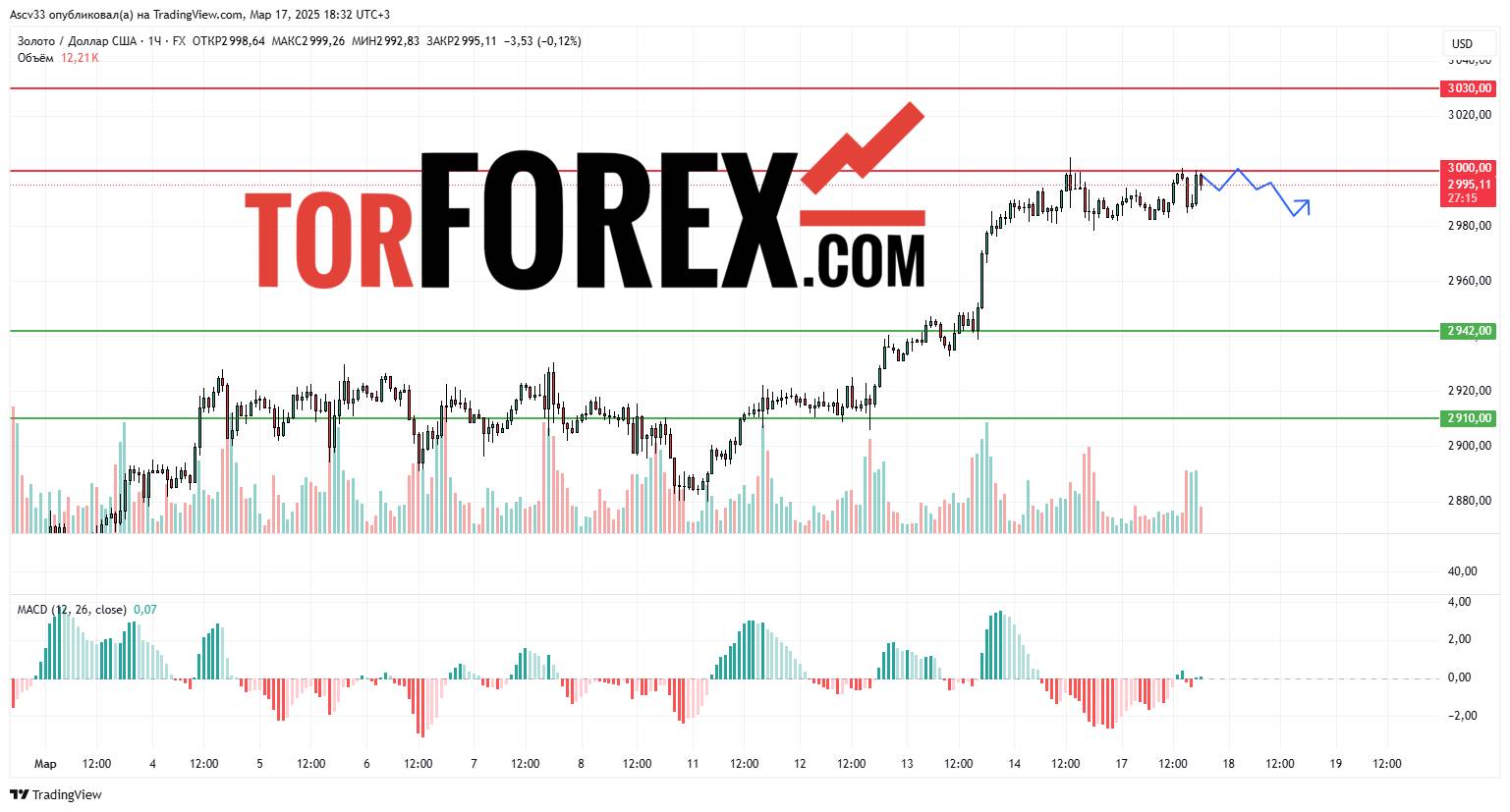 Технические индикаторы указывают на вероятность консолидации цены в текущем диапазоне. Если золото преодолеет $3 000, возможен дальнейший рост. Однако снижение ниже $2 942 может усилить коррекцию в сторону $2 910.