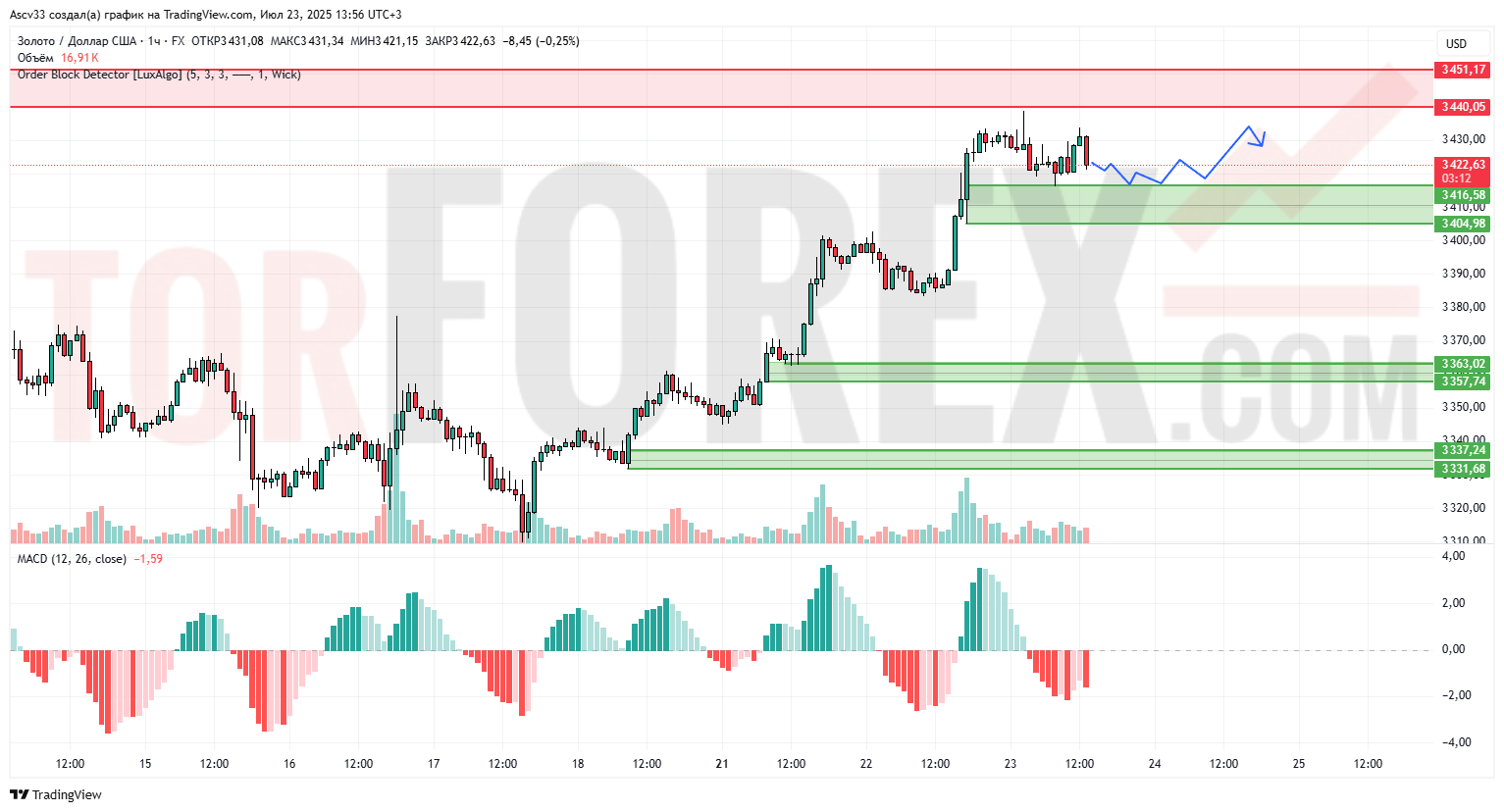 Ожидается боковое движение в диапазоне 3416–3440 с возможной попыткой пробоя вверх при благоприятных условиях. В случае пробоя ниже 3416 акцент сместится на поддержку 3405 и далее 3363. Пока цена удерживается выше 3416, сохраняется потенциал умеренного роста.
