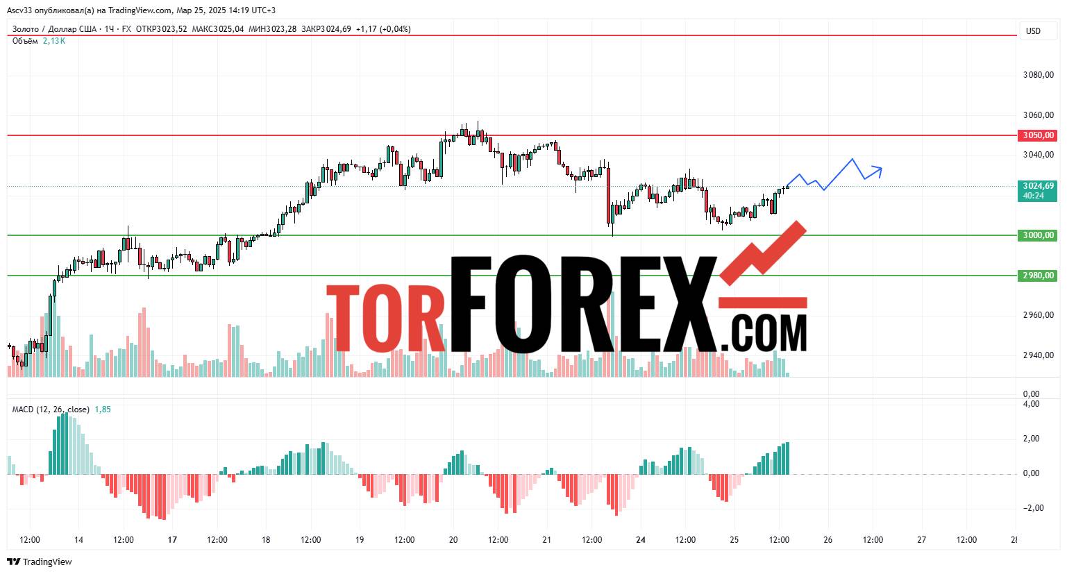 В течение ближайших суток XAU/USD, скорее всего, продолжит движение в диапазоне $3 000–$3 050. Устойчивое закрепление выше $3 050 откроет дорогу к $3 100. При снижении ниже $3 000 повышается вероятность отката к $2 980. Внимание стоит уделить реакции цены на уровнях $3 000 и $3 050 — именно там вероятны торговые сигналы, определяющие дальнейшее направление котировок.