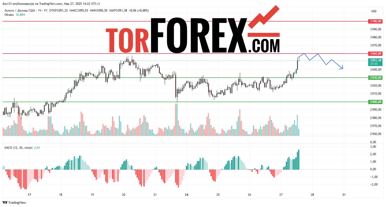 В течение следующих суток XAU/USD, вероятнее всего, останется в диапазоне $3 030–$3 060. Закрепление выше $3 060 станет сигналом к продолжению роста, возможно до $3 100. При откате ниже $3 030 не исключено снижение к $3 000.