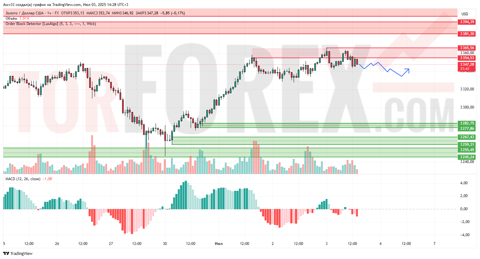 Цена, вероятно, останется в боковом диапазоне между 3 345 и 3 355 с риском краткосрочного отката к 3 328. Если поддержка 3 328 устоит, возможен повторный тест 3 360. Пробой выше откроет путь к 3 380–3 394, но пока вероятность роста ограничена без обновления объёмов и импульса.