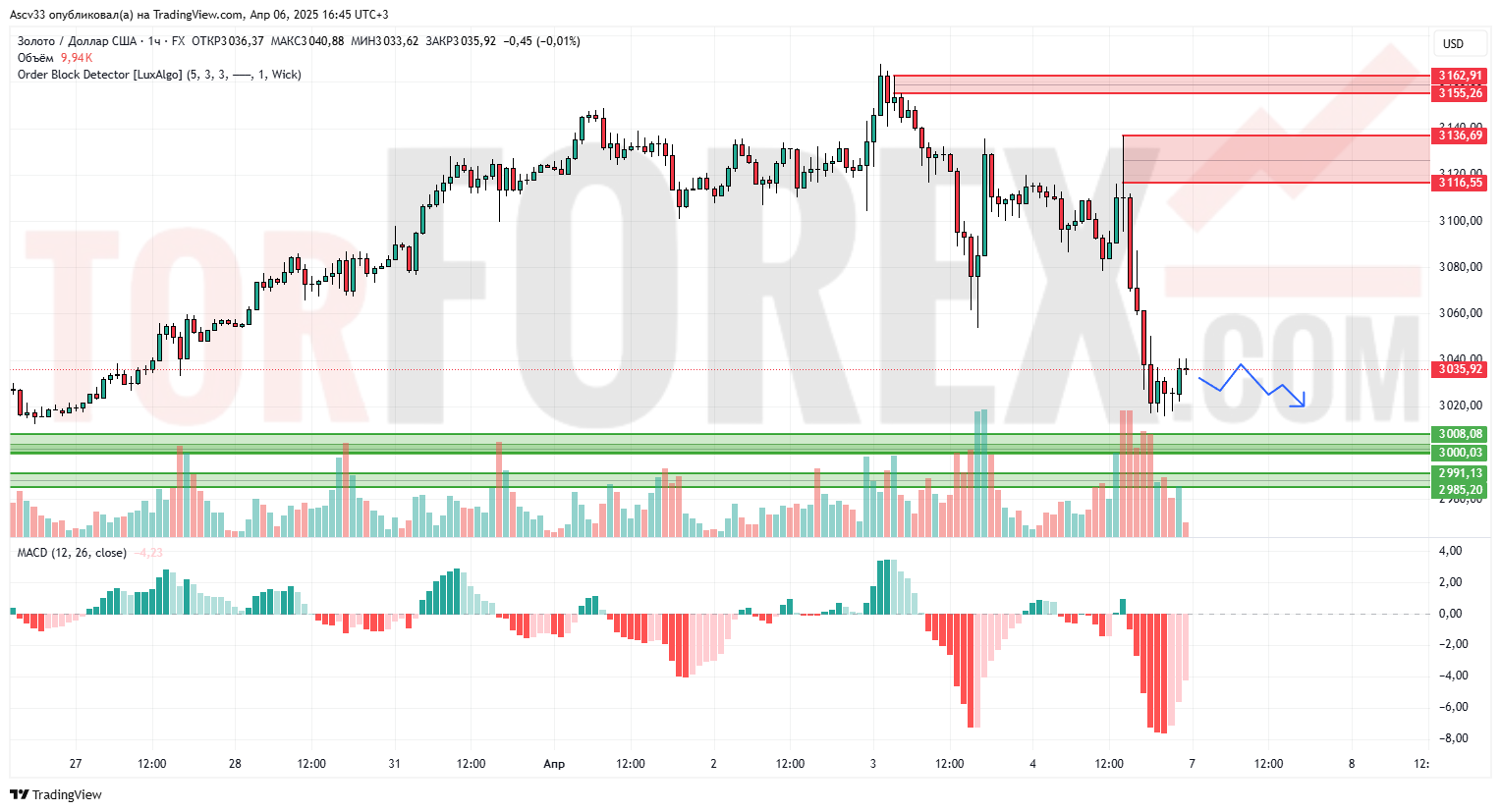 На часовом графике золото консолидируется после стремительного снижения от области сопротивления $3 116. После теста зоны поддержки в районе $3 000 цена отскочила вверх, но остаётся под давлением. Движение может перейти в боковую фазу с прицелом на повторную проверку поддержки.