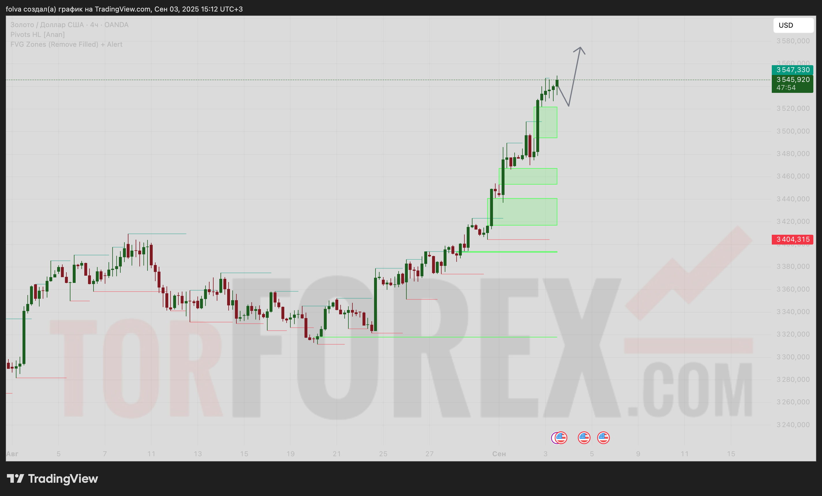 Золото (XAU/USD) на 4-часовом графике продолжает уверенный восходящий тренд. После серии импульсных свечей котировки достигли области 3 545–3 550 и обновили локальные максимумы. Сильное восходящее движение сопровождалось формированием нескольких FVG-зон, которые в будущем могут выступить поддержкой при коррекциях.