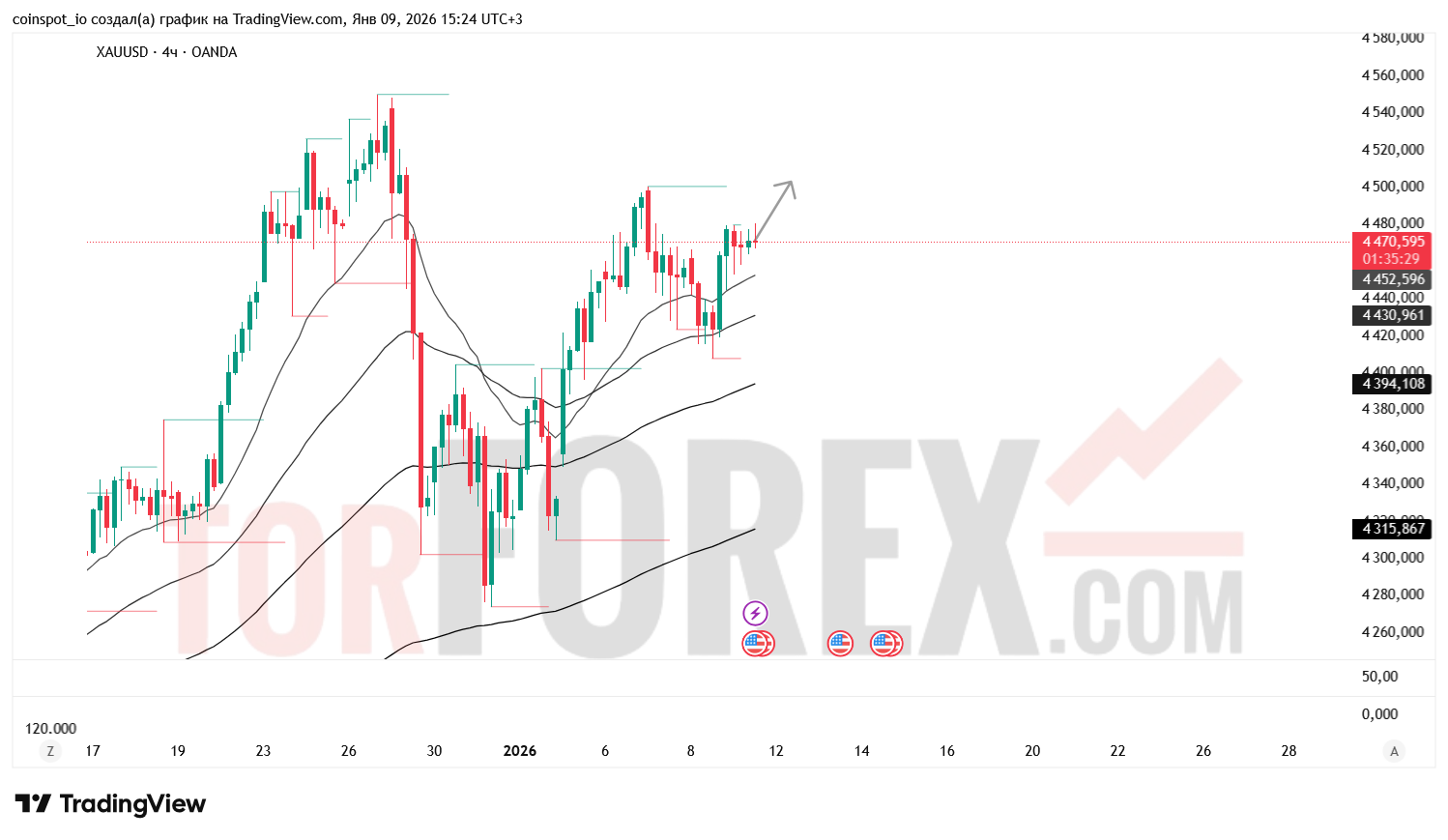 На 10 января 2026 года XAU/USD сохраняет нейтрально-бычью структуру с признаками консолидации. Основной сценарий — восстановление к 4 490–4 520 USD при пробое зоны сопротивления. Альтернативный сценарий — откат к 4 440–4 420 USD при отказе от уровня 4 470.94 USD.