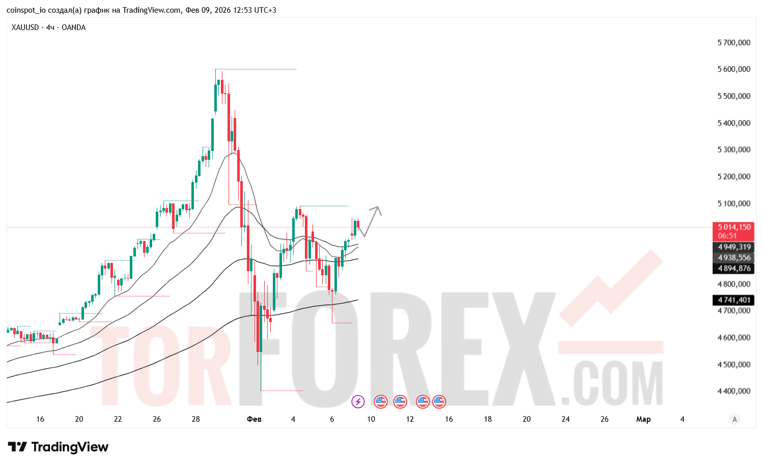 На 10 февраля 2026 года ключевым диапазоном остаётся зона 4980–5020 USD. Внутри неё формируется краткосрочный баланс, определяющий дальнейшее направление. Потенциальные входы — от нижней границы диапазона при подтверждении сигналов RSI и MACD с целями 5050–5080 USD. Альтернативный вариант — пробой 4980 USD и движение к 4900 USD, где возможен отскок от FVG и EMA‑кластера.