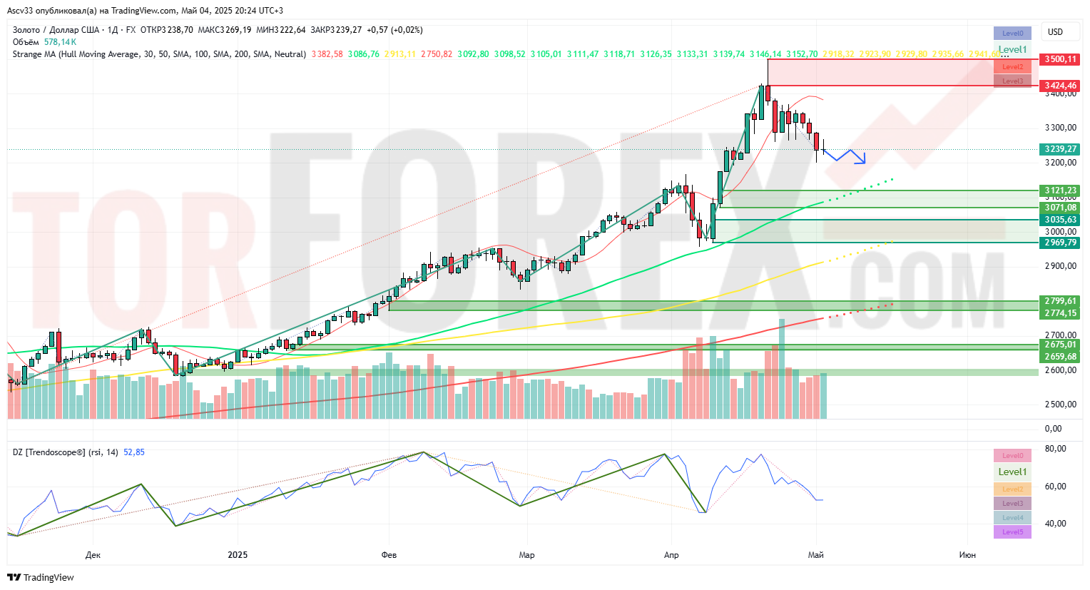 Золото завершает первую неделю мая под давлением продавцов. После стремительного роста до новых исторических максимумов выше $3 350 котировка скорректировалась к $3 239. Это техническая реакция на перекупленность, но снижение может продолжиться — график указывает на потенциальную фазу распределения. Инвесторы ожидают новых ориентиров от ФРС и инфляционных данных.