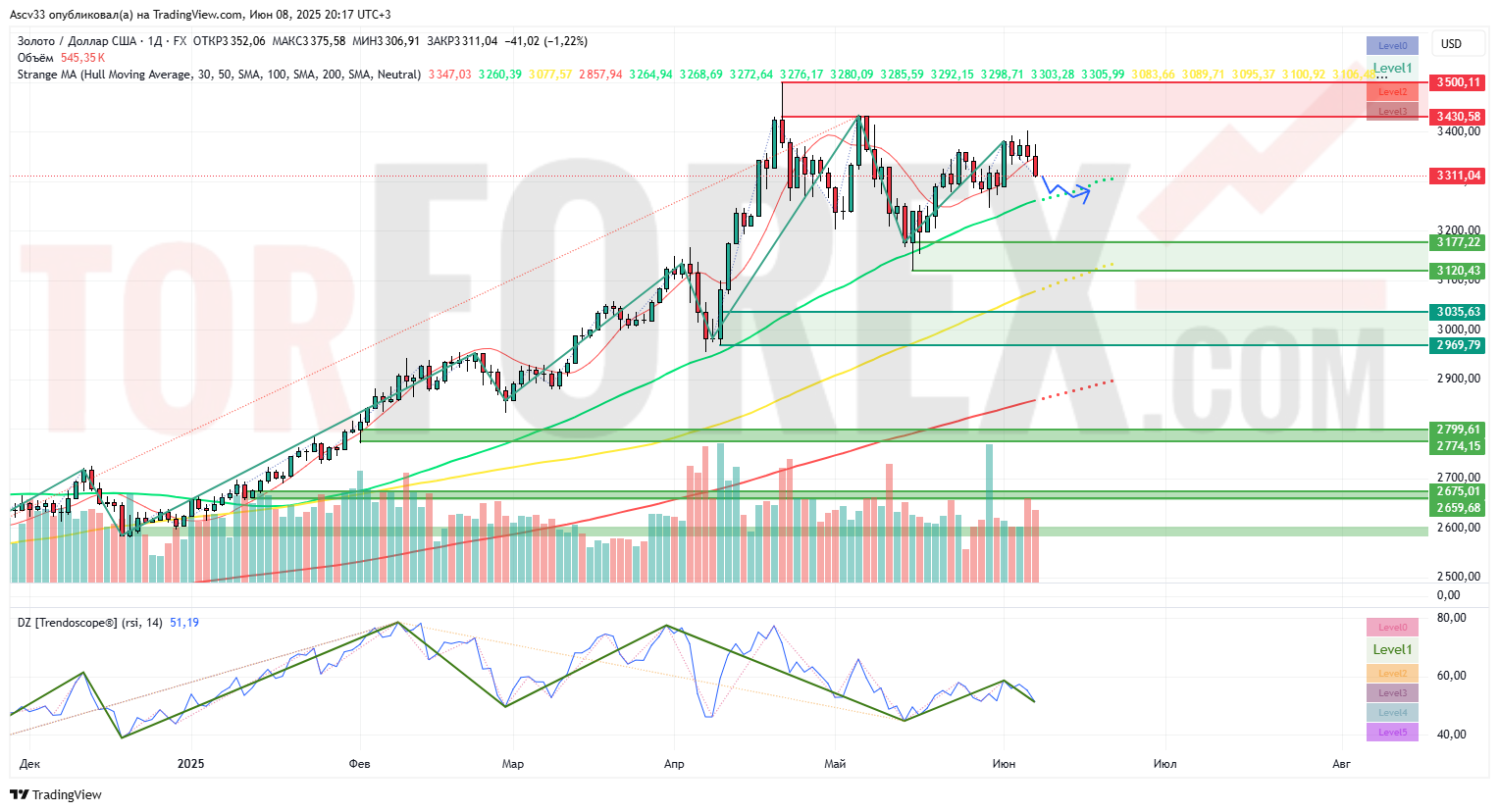 Золото завершило первую неделю июня снижением, отступив от локальных максимумов вблизи $3,350. Пара XAU/USD продолжает торговаться в восходящем канале, однако потеря темпа роста и реакция на зону предложения указывает на возможную коррекцию в ближайшие дни. Трейдеры внимательно следят за динамикой вблизи $3,300.