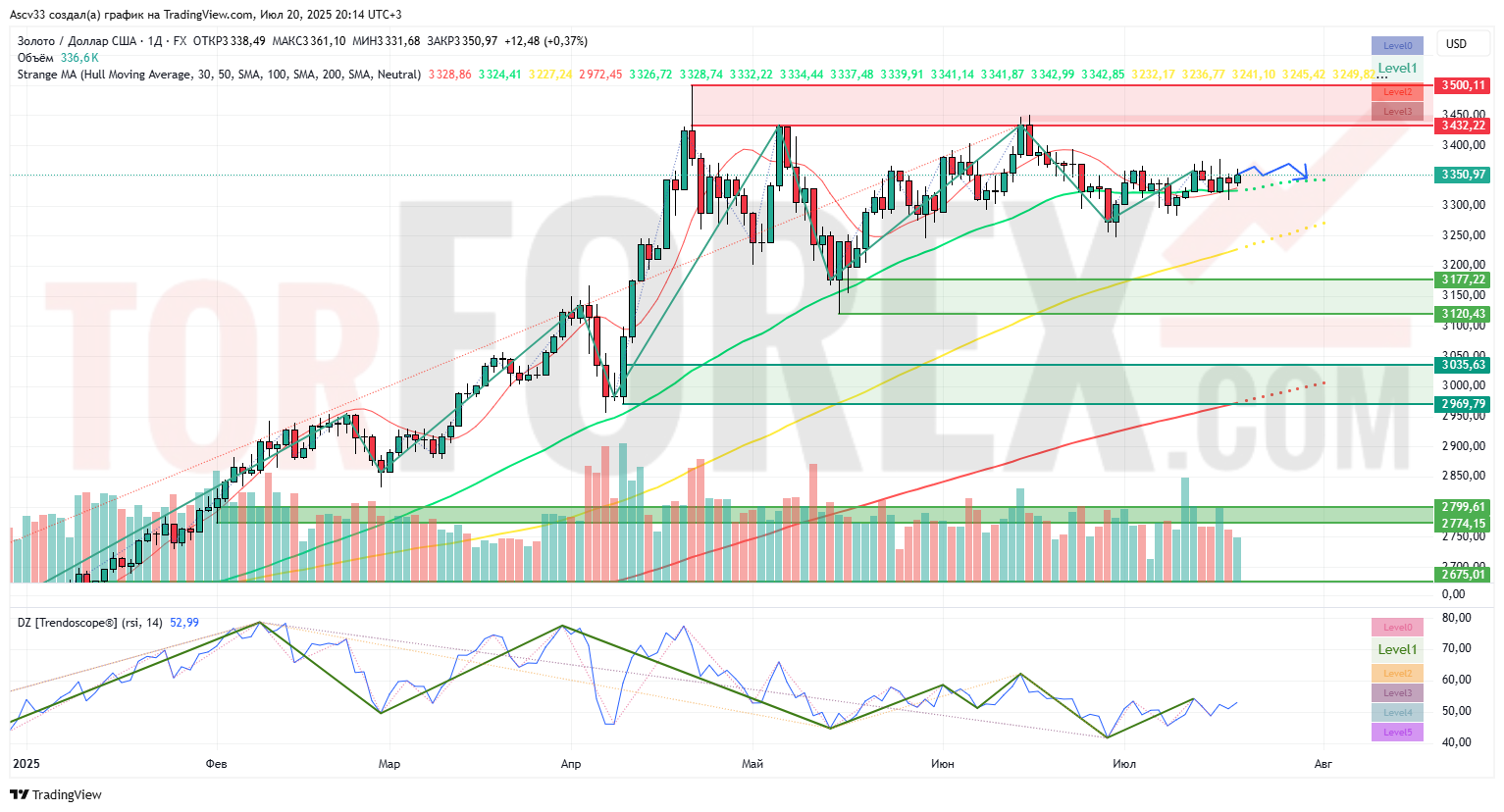 При пробое зоны $3430 и закреплении выше $3450 откроется путь к следующей цели — $3500. Этот уровень представляет собой важный психологический барьер и может привлечь дополнительную ликвидность.