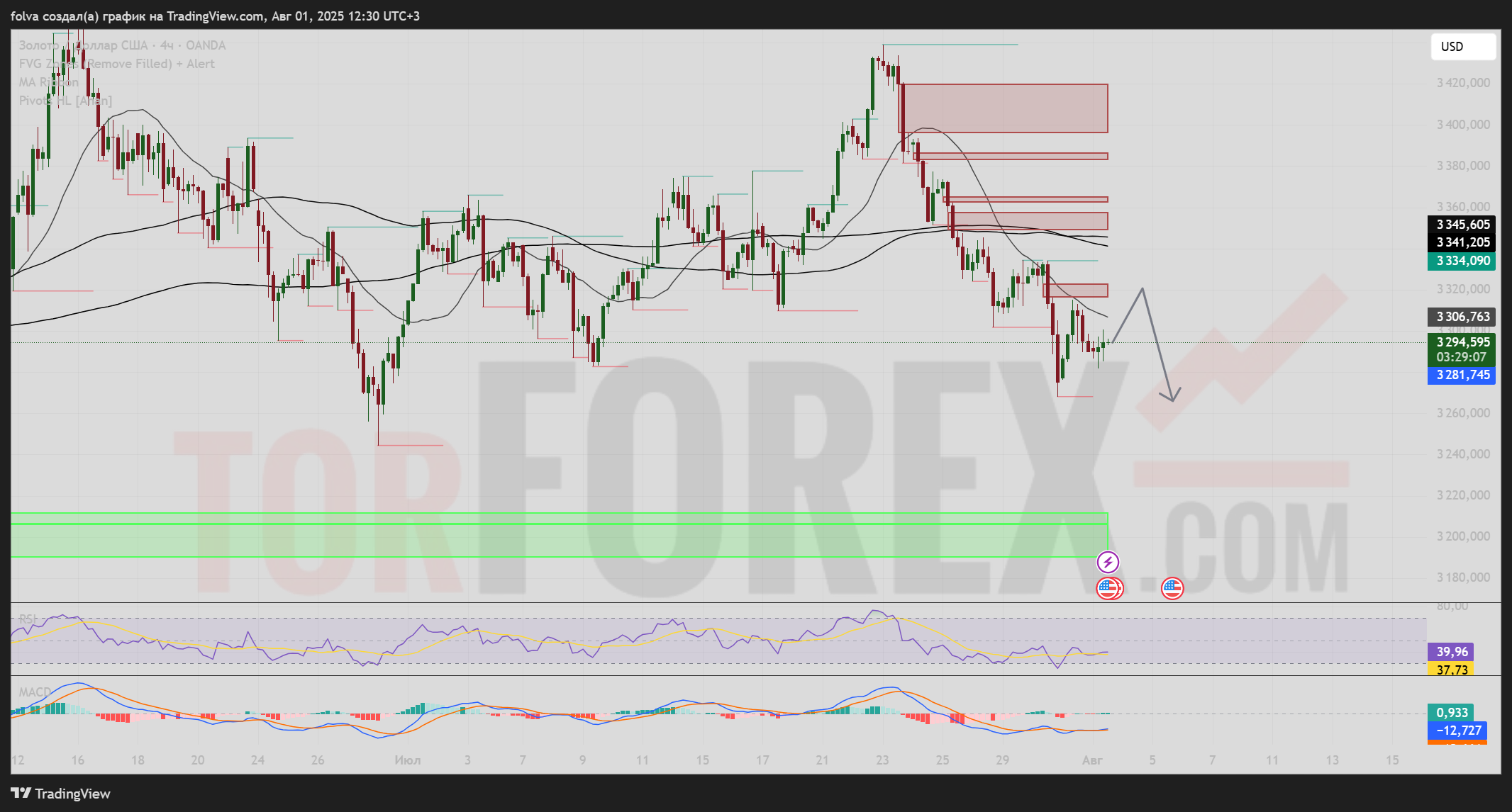 На 4-часовом графике цена формирует серию понижающихся максимумов и минимумов (LH/LL), начиная с пиков 3402.8. После пробоя ключевого уровня 3301.7, золото протестировало минимум на 3281.7 и частично отскочило к текущему значению 3294.6.