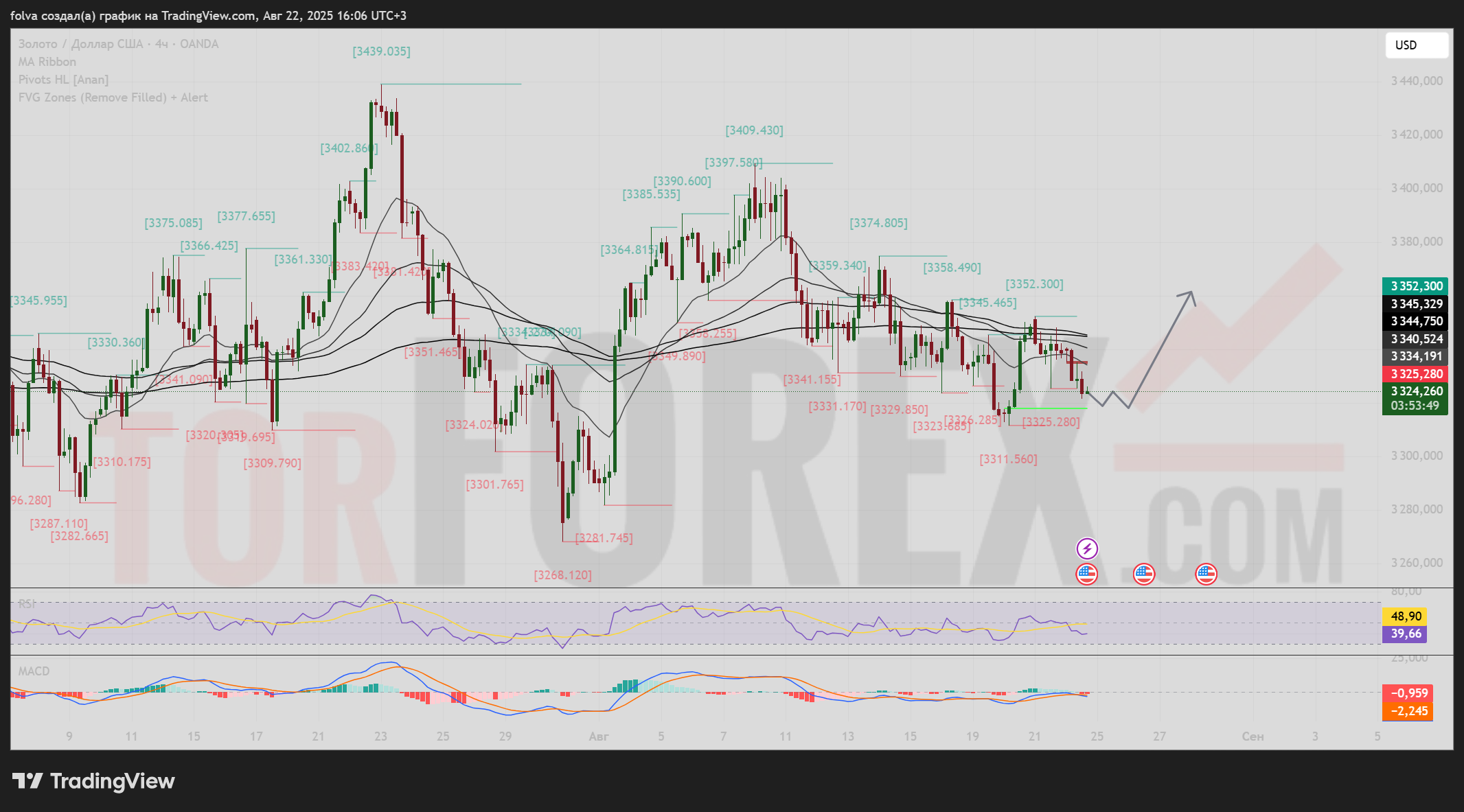 На 23 августа 2025 года золото остаётся в фазе нисходящей коррекции, однако ключевая поддержка $3 325–$3 311 сдерживает дальнейшее падение. Локальные индикаторы указывают на возможность технического отскока, но общая структура рынка остаётся медвежьей.