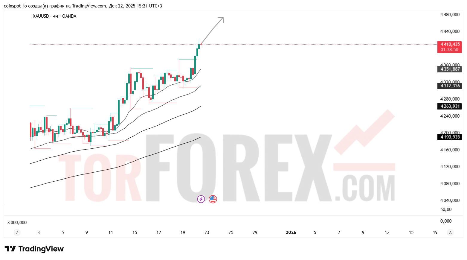 На 23 декабря 2025 года XAU/USD демонстрирует устойчивый восходящий импульс. Основной сценарий — рост к 4 430–4 470 USD при пробое сопротивления. Альтернативный сценарий — снижение к 4 300–4 278 USD при отказе от уровня 4 410 USD.