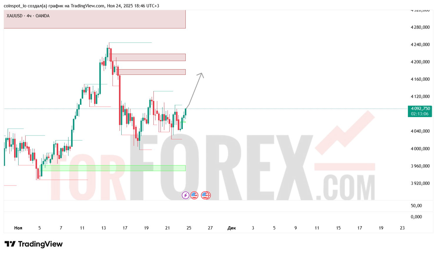 На 25 ноября 2025 года XAU/USD сохраняет бычий импульс. Основной сценарий — движение к 4140 и 4175 USD. Торговая идея: открытие длинных позиций при закреплении выше 4100 USD, с стоп-лоссом ниже 4070 USD. Альтернативный сценарий — шорт при отказе от 4100 USD, с целями 4000 и 3970 USD, и стоп-лоссом выше 4115 USD.xauusd-prognoz-25.11.2025