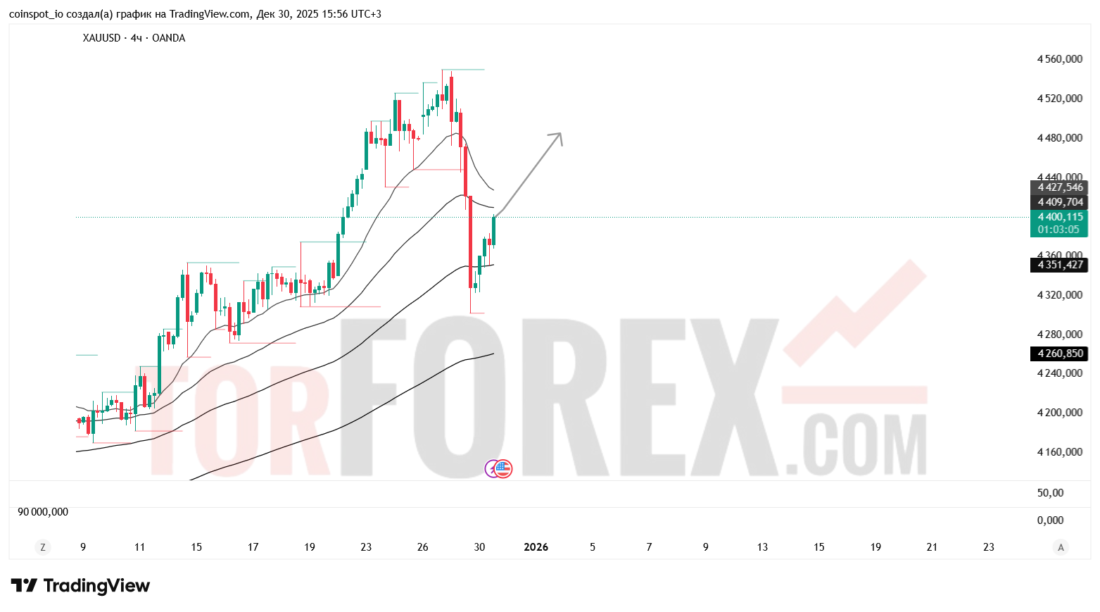 На 31 декабря 2025 года XAU/USD сохраняет нейтрально-бычью структуру с признаками восстановления. Основной сценарий — рост к 4 464–4 500 USD при пробое зоны сопротивления. Альтернативный сценарий — откат к 4 350–4 320 USD при отказе от уровня 4 398 USD.
