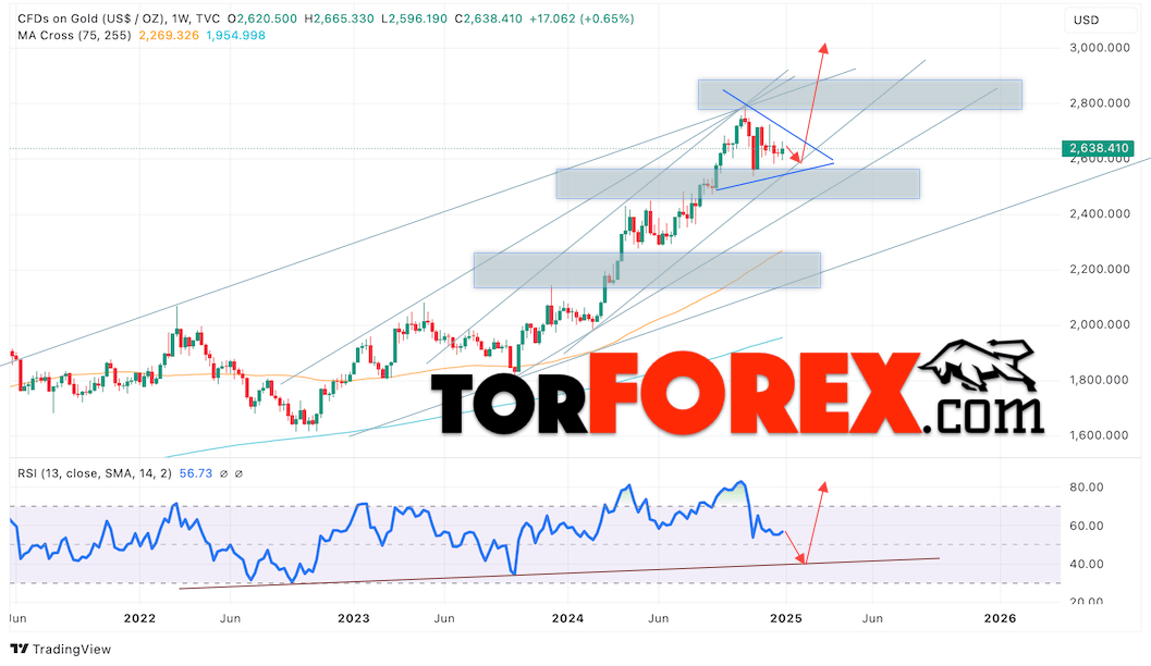 Дополнительным сигналом в пользу роста котировок XAU/USD выступит тест линии поддержки на индикаторе относительной силы. Вторым сигналом станет пробой от нижней границы модели «Треугольник». Отменой варианта роста цен в январе 2025 выступит падение цен и пробой уровня 2565. Это укажет на пробой нижней границы бычьего канала и продолжение падения котировок актива в область ниже уровня 2485. Ожидать ускорения подъёма котировок XAU/USD стоит с пробоем области сопротивления и закрытием цены над уровнем 2665, что укажет на пробой верхней границы модели «Треугольник» и начало реализации паттерна с целями вверху.