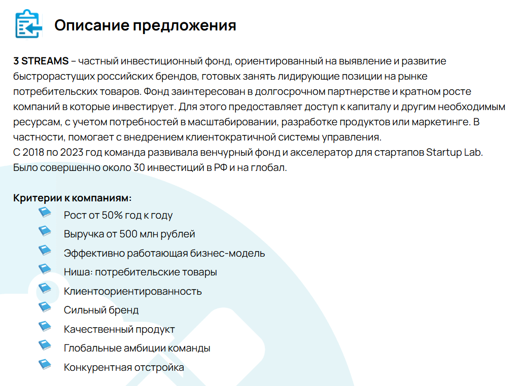 Фонд 3 Streams делает инвестиции в компании, которые уже показывают быстрый рост и имеют выручку от ₽150,000,000, а основная цель состоит в долгосрочном партнерстве. Например, проект вложился в сервис подбора шин Shinsale, в производителя одежды Enn, в компанию по производству климатической техники «Бризекс», в мебель для геймеров Vmmgame и другие стартапы.