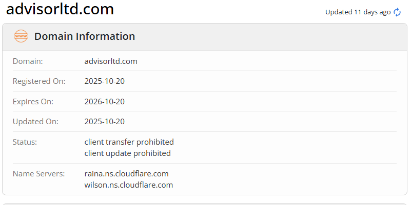 Возраст имеет значение. Сайт компании был зарегистрирован 20 октября 2025. То есть, на момент нашей проверки ему было меньше двух недель. В мире финансов это как минимум повод насторожиться. Поскольку серьезные игроки работают годами, а не появляются «вчера».