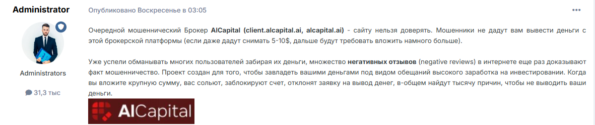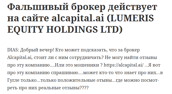 В сети масса позитивных отзывов об Al Capital, написанных в августе 2025 года. Это заказные комментарии, где пользователи рассказывают о преимуществах сайта, которого даже не видели. Вычислить обман просто, достаточно ознакомиться с предложенными брокером условиями. Негатива об Ал Кэпитал меньше, но он больше похож на правду. Такие конторы обычно разводят на дополнительные платежи при попытке вывода средств, а также сливают депозиты клиентов.