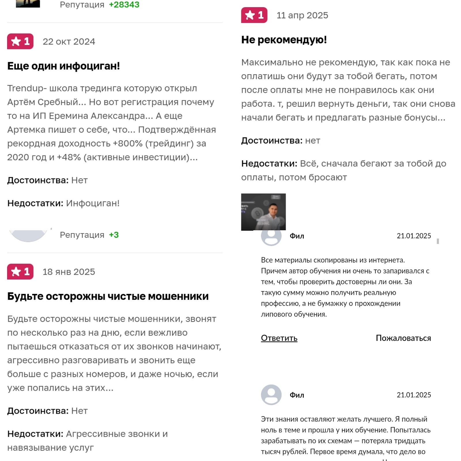 TrendUp предлагает некоторые программы бесплатно, а также у сообщества оставлен номер ИП. Однако документов на проведение образовательной деятельности нет, и многие ученики недовольны качеством предоставляемых курсов. Из прочих сомнительных моментов мы отметили:
