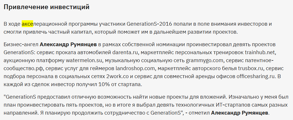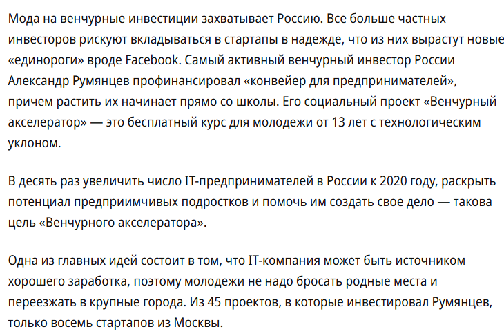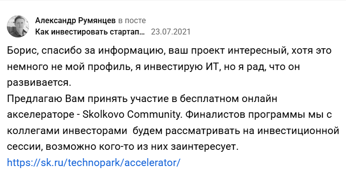 На сайте VC Александр сообщает одному из пользователей, что не готов инвестировать деньги в его проект. Однако он все равно «протягивает руку помощи», предлагая ему участвовать в другом бесплатном акселераторе. Подобная отзывчивость — еще один аргумент в пользу Румянцева.