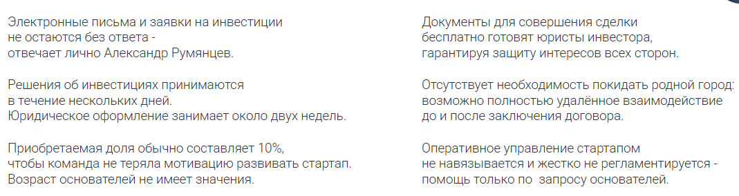 «Брокер» Александр Румянцев предъявляет высокие требования к стартапу, в который он готов вложиться. У проекта должны быть команда, минимальная версия продукта и план развития, сделанный по типовому шаблону. Таким образом, «услуги» этого инвестора подойдут не для всех.