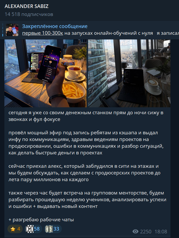 Владелец проекта рассказывает о своей шикарной жизни, но не предоставляет никаких кейсов клиентов и доказательств хоть какого-то заработка, поэтому мы советуем отказаться от такого непрозрачного сотрудничества с владельцем канала в Телеграмм Alexander Sabiz, так как даже отзывов о нем нет.
