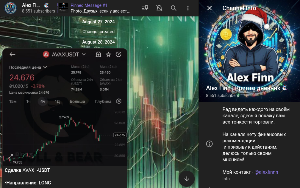 Деятельность телеграм-канала «Alex Finn Крипто Дневник» стартовала 27 августа 2024 года. В качестве демонстрации своих навыков эксперт Алекс Финн прикрепил скриншот графика фьючерса AVASUSDT и под ним опубликовал первый свой торговый сигнал.