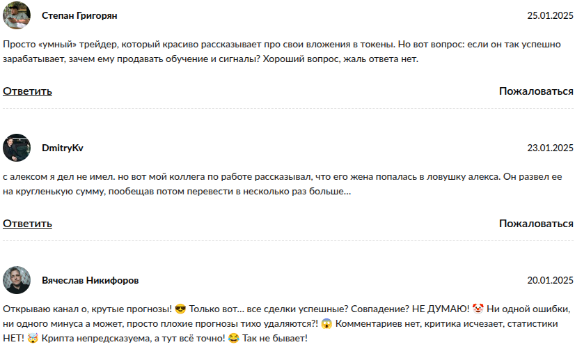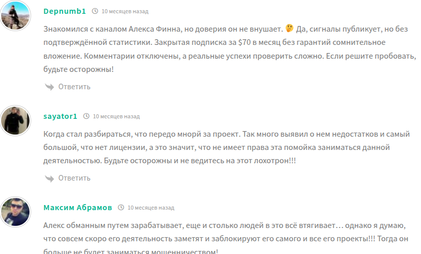 Бывшие подписчики сообщества отмечают, что Алекс через бот Alexxfinn bot дает аналитику, которая не соответствует реальности. Заключать сделки по сигналам нельзя, потому что гарантированно будут убытки.