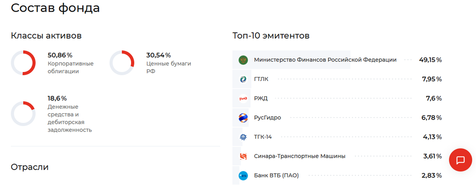 Паевой фонд «Облигации плюс» – это актив, состоящий из облигаций государственного займа и корпоративных. Детальный состав портфеля вы можете видеть на фото ниже. Он на 50% состоит из корпоративных облигаций, на 30 из российских ценных бумаг и на 18% из дебиторской задолженности. Львиная доля облигаций – это бумаги МинФина.
