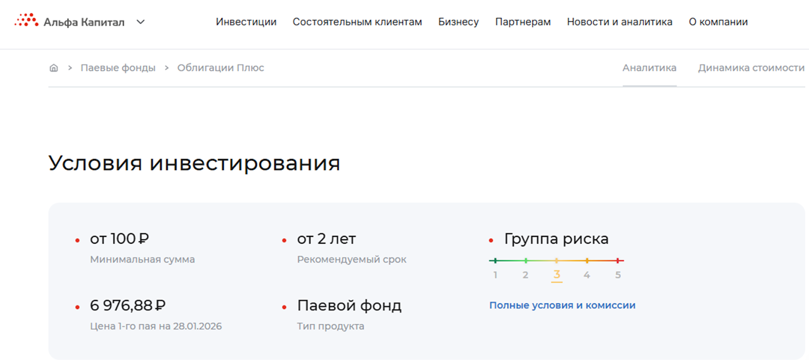 Рекомендованный срок размещения средств составляет 2 года, но забрать деньги можно и раньше. Актив имеет показатель группы риска 3 по пятибальной шкале.