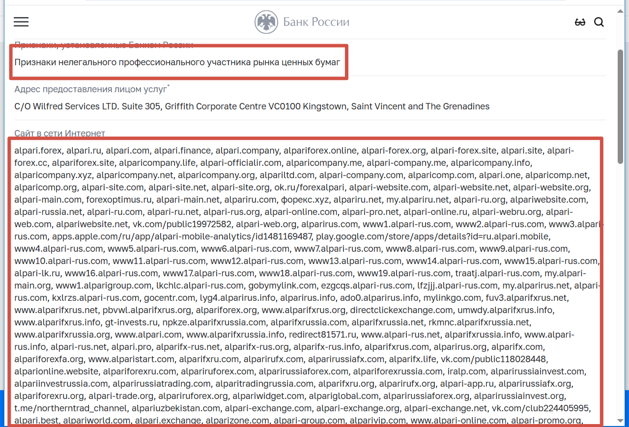 Нам не удалось найти фирму в официальных реестрах Центробанка РФ. Это означает, что российской лицензии компания не имеет и действует в нашей стране незаконно. Во время более детальной проверки установили, что Alparirusforex находится в черном списке Центробанка. Формулировка – признаки нелегального профессионального участника рынка ценных бумаг. В список регулярно вносятся изменения. Это связано с тем, что Alparirusforex Com постоянно меняет доменные имена. Наиболее известные: alparirusforex com ru, alpari rus forex, trade alparirusforex com. На момент написания обзора, российским регулятором заблокировано около полусотни сайтов фальшивого брокера.