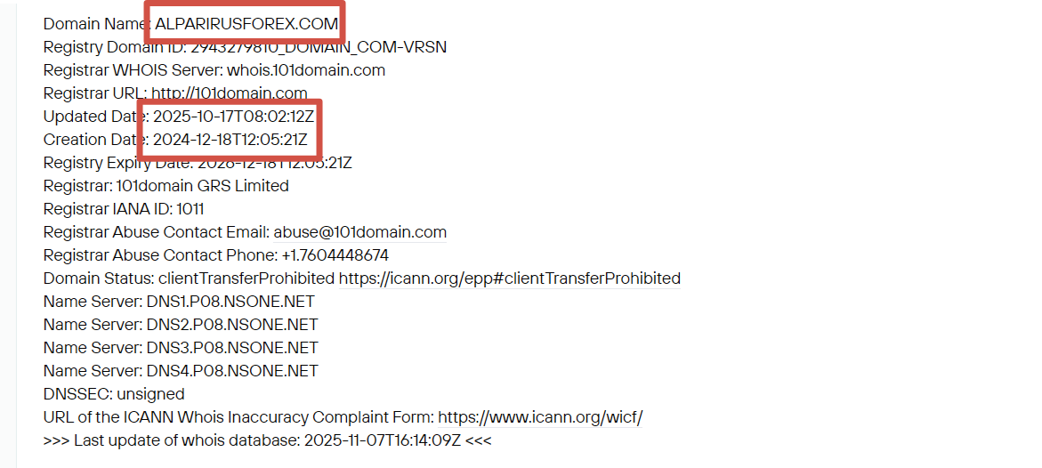 На данный момент вся информация о брокере и форма для регистрации расположена на официальном сайте alparirusforex com. Проверка показала, что домен выкуплен владельцами брокера в 10 октября 2025 года. Это вызывает сомнения в указанном возрасте компании.