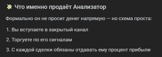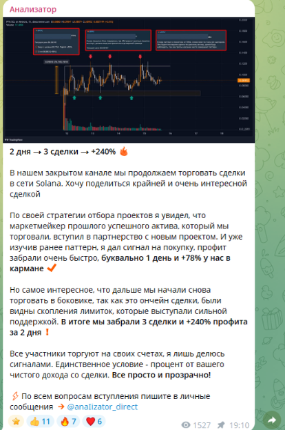 В Сети есть разоблачения, где эксперты кратко описывают формат работы с телеграмм-каналом «Анализатор». Так, пользователям демонстрировали платный тгк, где публиковали сигналы для трейдинга. С каждой успешной сделки клиенты были обязаны отдавать часть прибыли анонимному трейдеру.
