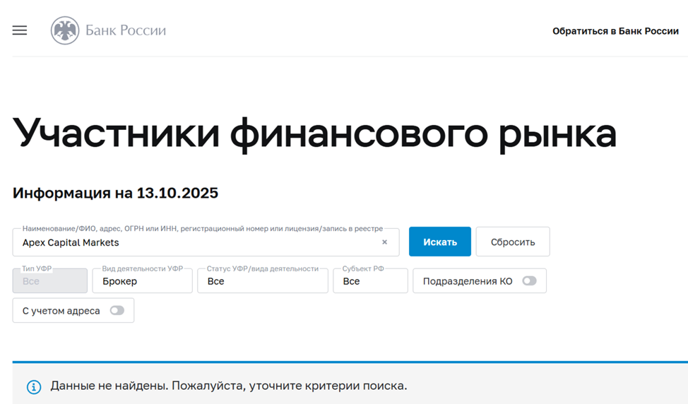 Работу брокерской компании Apexcapital Markets Com нельзя назвать законной из-за отсутствия лицензии ЦБ РФ. В реестре регулятора не оказалось информации об этой площадке. Значит, она работает нелегально. Торговать на таком сайте опасно из-за риска пропажи денег.