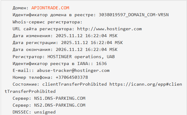 В подвале сайта нет никакой юридической информации – ни лицензий от финансовых органов, ни физического адреса. Вполне возможно, что деятельность компании вообще никем не регулируется. Неизвестно, когда была запущена платформа, однако домен ApionTrade com зарегистрирован 12 ноября 2025, то есть на момент выхода обзора, в начале февраля 2026, брокеру всего три месяца.