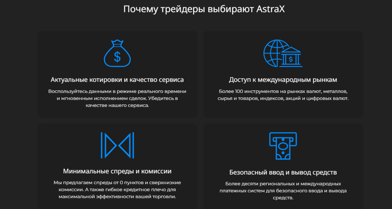 Торговля 6 классами активов – основная деятельность сомнительного посредника. Брокер AstraX предлагает розничным и институциональным инвесторам торговать на многофункциональной платформе для ПК и девайсов валютными парами, металлами, сырьем, товарами и другими активами. Всего к услугам трейдеров 500+ торговых инструментов. Главными своими преимуществами брокерская организация считает: