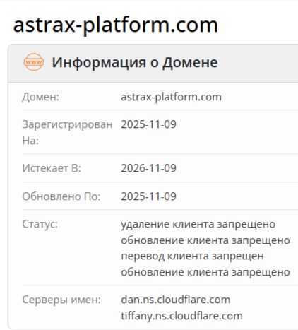 По итогам обследования веб-сайта astrax platform com стоит отметить. Домен появился в мировой паутине 09 ноября 2025 года. На момент обзора сомнительному брокеру едва исполнился месяц. Это незначительный срок для получения статуса надежного. Однако достаточный для публикации документов, обеспечивающих клиентам определенные гарантии. Нежелание подтвердить легальность деятельности говорит о потенциальном мошенничестве и обмане.