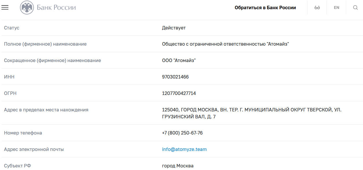 У цифровой платформы «ЦФА Атомайз» ру есть официальное юридическое лицо. По реестрам Центробанка мы выяснили, что ИНН компании — 9703021466, ОГРН — 1207700427714. Центральный офис биржи расположен по адресу — 125040, ГОРОД МОСКВА, ВН. ТЕР. Г. МУНИЦИПАЛЬНЫЙ ОКРУГ ТВЕРСКОЙ, УЛ. ГРУЗИНСКИЙ ВАЛ, Д. 7. Контакты для связи — +7 (800) 250-67-76, электронная почта — info atomyze team. Уставной капитал — свыше 92 миллиона рублей.