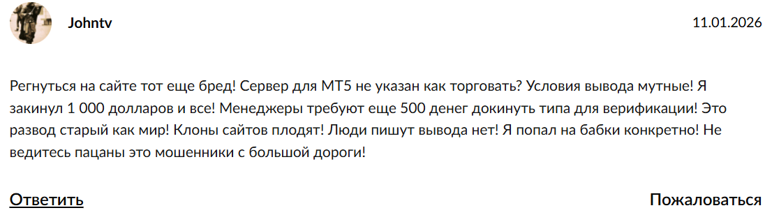 После того как пополнил счет на 1 000 долларов, операторы затребовали дополнительно 500 якобы на проверку личности. Стандартная схема развода – привлекают небольшой суммой, затем выкачивают больше под выдуманными предлогами.