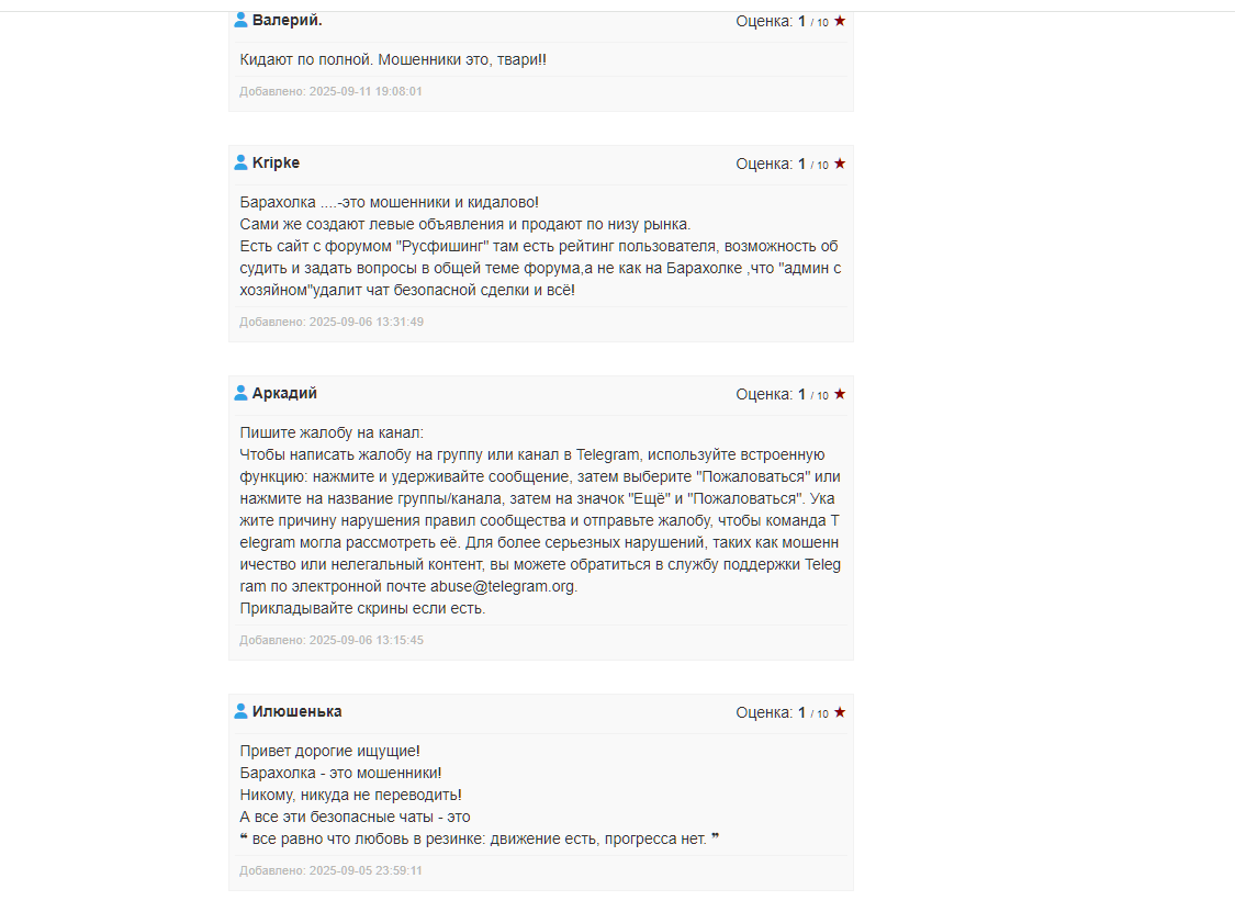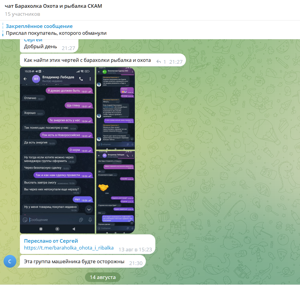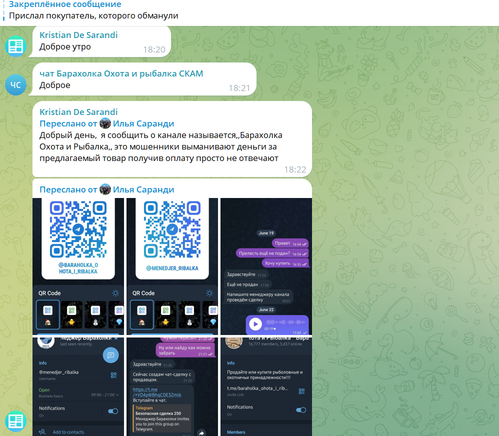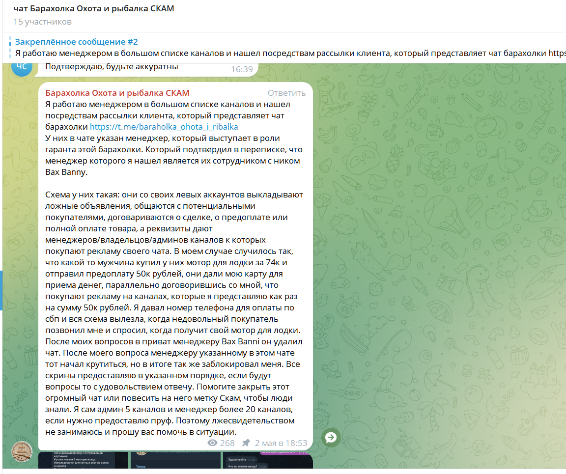 В ТГ уже создан канал «чат Барахолка Охота и рыбалка СКАМ». Здесь публикуется много негативных отзывов от обманутых пользователей, админов ТГ каналов и покупателей, которые потеряли деньги.
