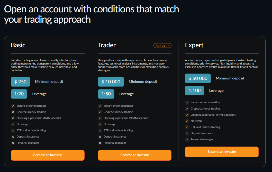 - Trader — предполагает внесение немалой суммы в $10,000. Кредитное плечо 1:50. Пользователям доступны: мгновенные ордера, криптовалютный трейдинг, памм-счета.
