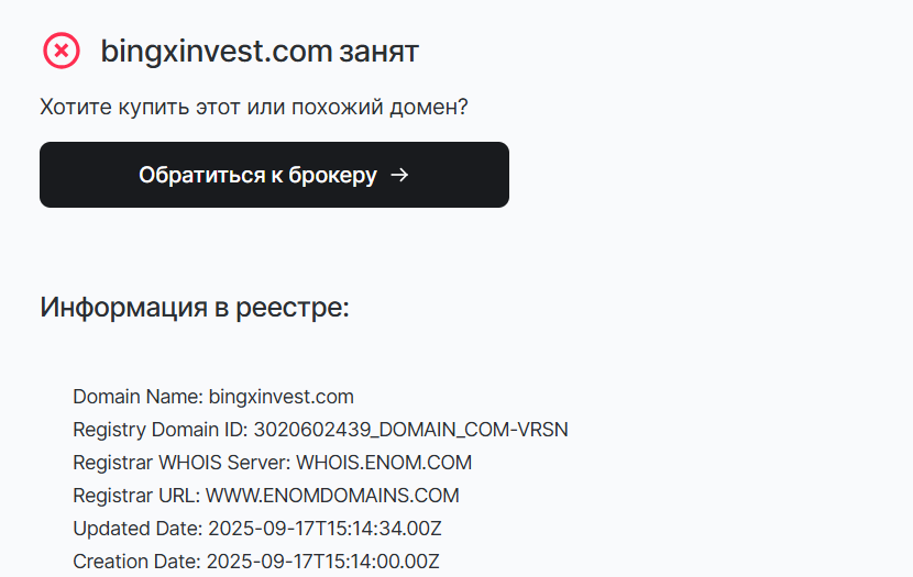 Сайт проекта зарегистрирован в конце сентября 2025 года. Это значит, что на момент обзора домен BingXInvest com существует всего пару месяцев.