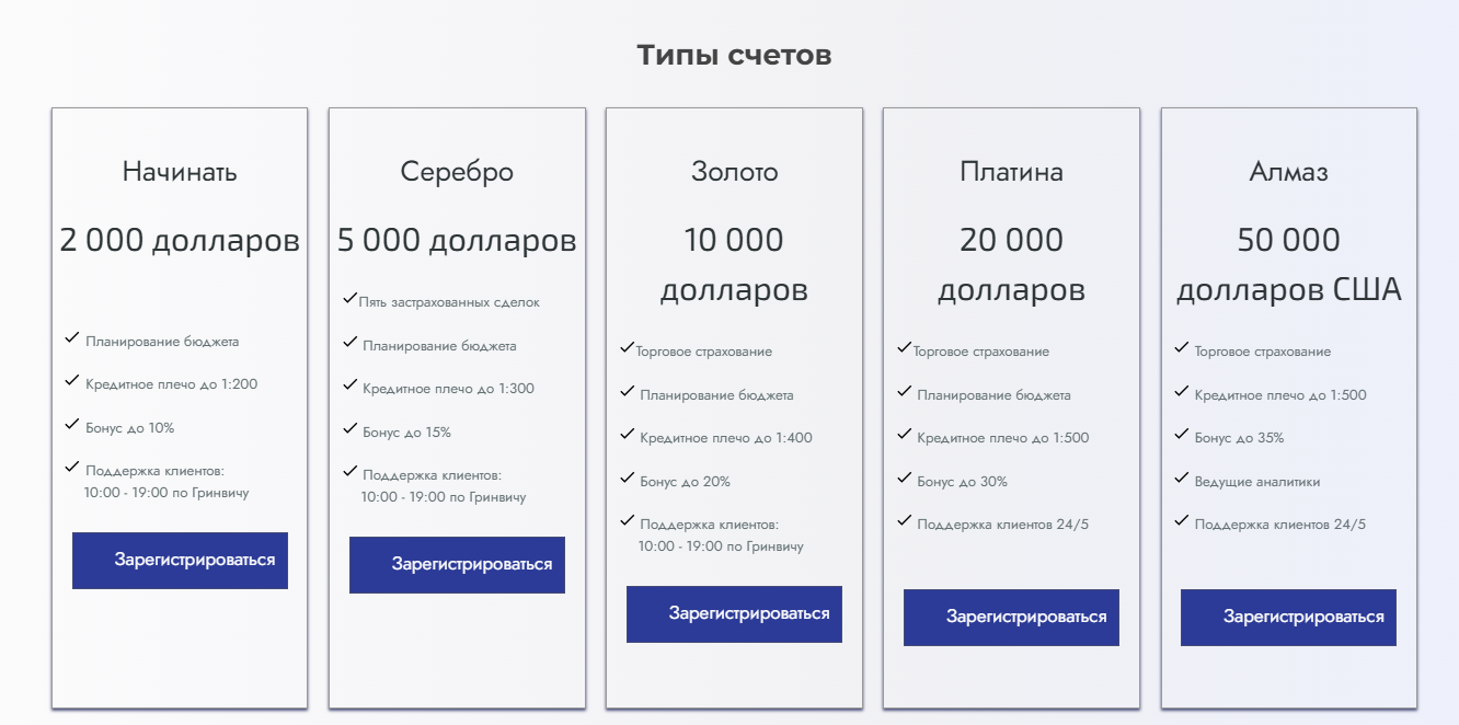 На сайте упомянуто несколько типов счетов. Они отличаются минимальным депозитом, плечом и обещанными бонусами. Вход в BingXInvest начинается примерно от $2,000. Более высокие тарифы требуют десятки тысяч. Взамен обещают выше уровень сервиса и улучшенные условия. Конкретных цифр по спредам и комиссиям не видно.