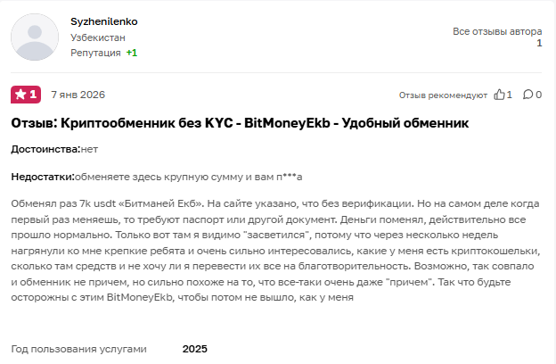 В сети есть лишь один негативный отзыв на «БитМани Екб», в котором пользователь пишет, что обменивал 7,000 USDT на площадке и думал, что все получится без верификации. Тем не менее, ее все же запросили и все прошло, однако позже к пользователю пришли незнакомцы и уточняли не хочет ли он перевести свои средства на благотворительность, что показалось ему странным.