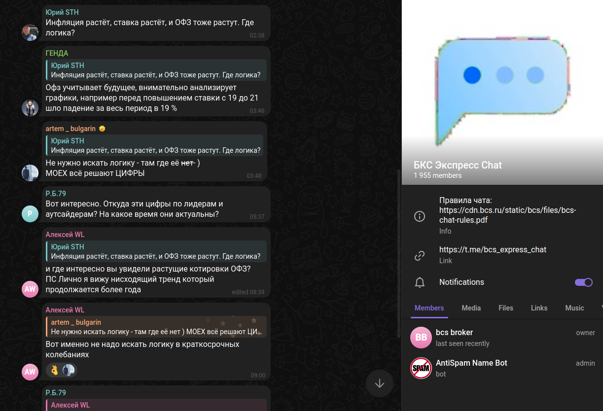 Участникам сообщества доступен чат Bcs express chat, где подписчики могут обсудить текущие события, известные методы торговать и заключать сделки.