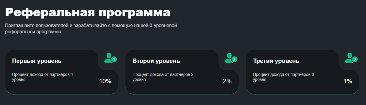 Работает реферальная программа на три уровня. Первый приносит 10% от депозита приглашенного. Второй дает 2%, третий – 1%. Схема мотивирует привлекать новичков. Продается PRO-подписка. Вкладчики участвуют в розыгрышах от 500 до 2000 рублей. Еще один способ выманить деньги.Условия для инвестиций