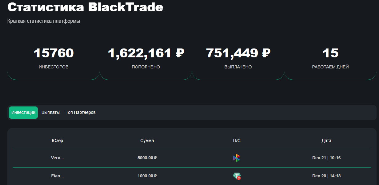 Главная страница «Блектрейд» демонстрирует статистику. 15760 инвесторов и 751 тысяч рублей уже выплатили. Данные обновляются сами. Но проверить цифры никак нельзя.